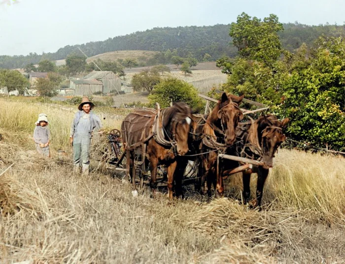 Отец и дочь работают на пшеничном поле с упряжкой лошадей, 1910 год.
