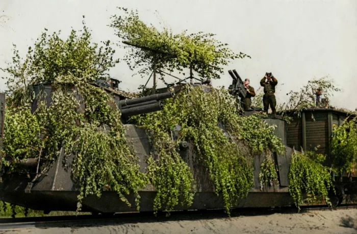 Советский бронепоезд открывает огонь по нацистским самолетам. Август 1941 года.