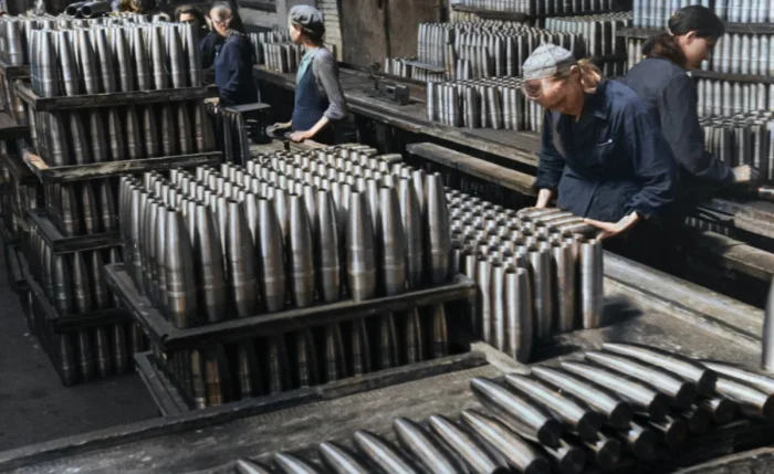 Женщины изготавливают артиллерийские снаряды на военном заводе в Сибири во время Великой Отечественной войны, июнь 1942 года.