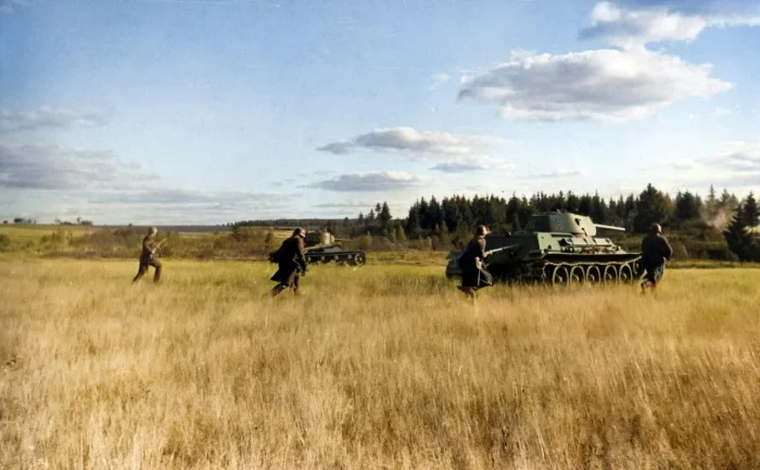 Советская пехота и танки Т-34 наступают. Октябрь 1941 года.