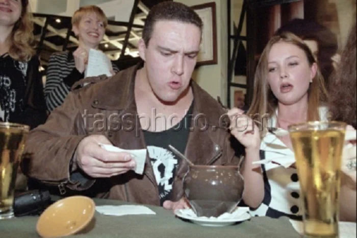 28 августа 1996 года, независимая ассоциация ньюсмейкеров России и клуб "Репортер" провели финальный тур всероссийского конкурса "Новый русский-96". Участниками конкурса стали представители ведущих российских фирм из самых разных сфер деятельности. На снимке: в конкурсе по поеданию пельменей принял участие президент российско-германского предприятия водолазных работ "Чудское озеро" Александр Курицын (Невский).