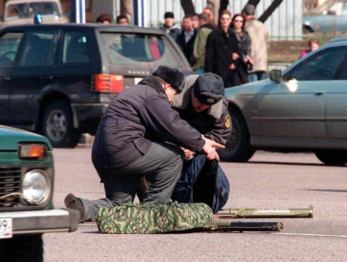 14. Сотрудники милиции осматривают два гранатомета перед посольством США в Москве, 28 Марта 1999 года.