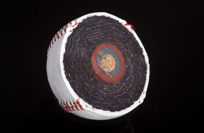 Под обмоткой из кожи скрывается плотный клубок нитей, а в центре - резиновая или пробковая сердцевина. Именно эта конструкция придает мячу упругость.