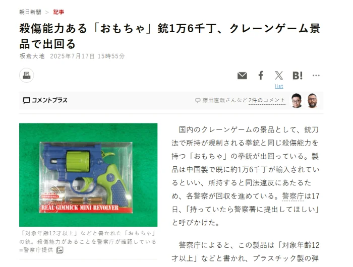 Представитель токийской полиции заявил, что "это беспрецедентный случай, когда под видом безобидных развлечений в страну ввезли тысячи единиц функционального оружия". Уже зафиксирован как минимум один инцидент с угрозами с использованием такого револьвера, и специалисты предупреждают о риске случайных выстрелов, которые могут привести к трагедии.
