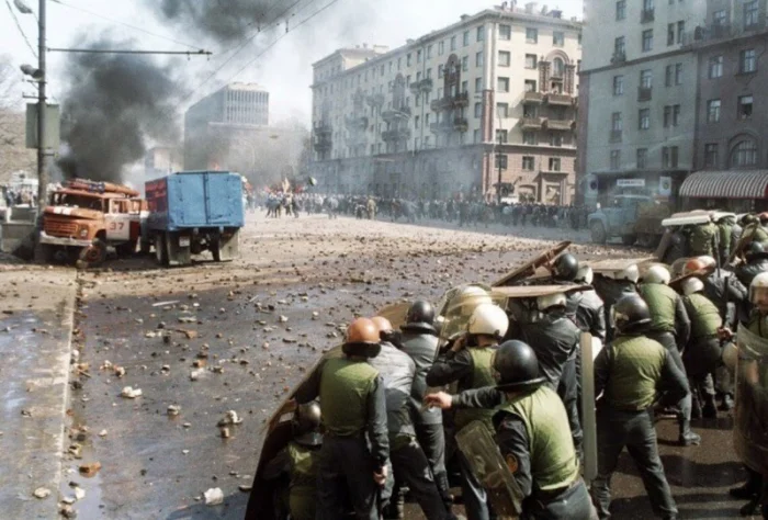 21. Сторонники оппозиции на первомайской демонстрации забрасывают камнями ОМОНовцев. Москва. 1993 г. Фото Владимир Федоренко.