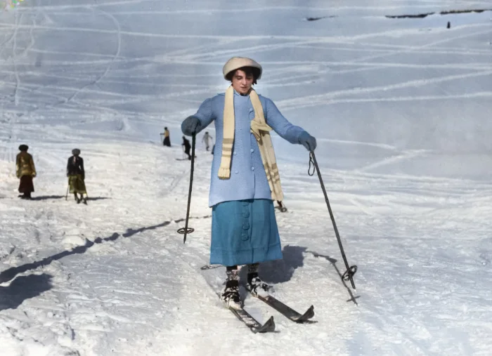 Герцогиня Вестминстерская Констанция Эдвина, первая жена 2-го герцога Вестминстерского Хью Ричарда Артура Гросвенора, катается на лыжах в Швейцарии, 1 января 1912 года.