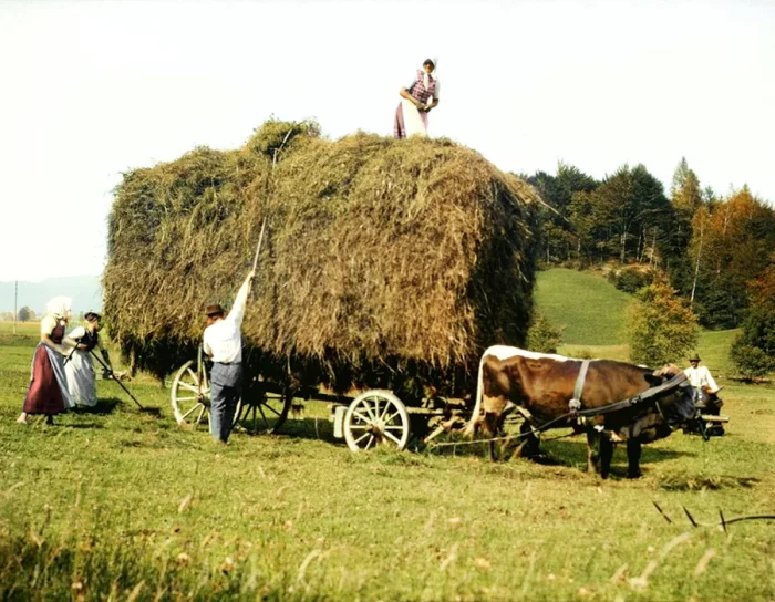 Фермеры везут стог сена на повозке, запряженной волами. Австро-Венгрия, 1904 год.