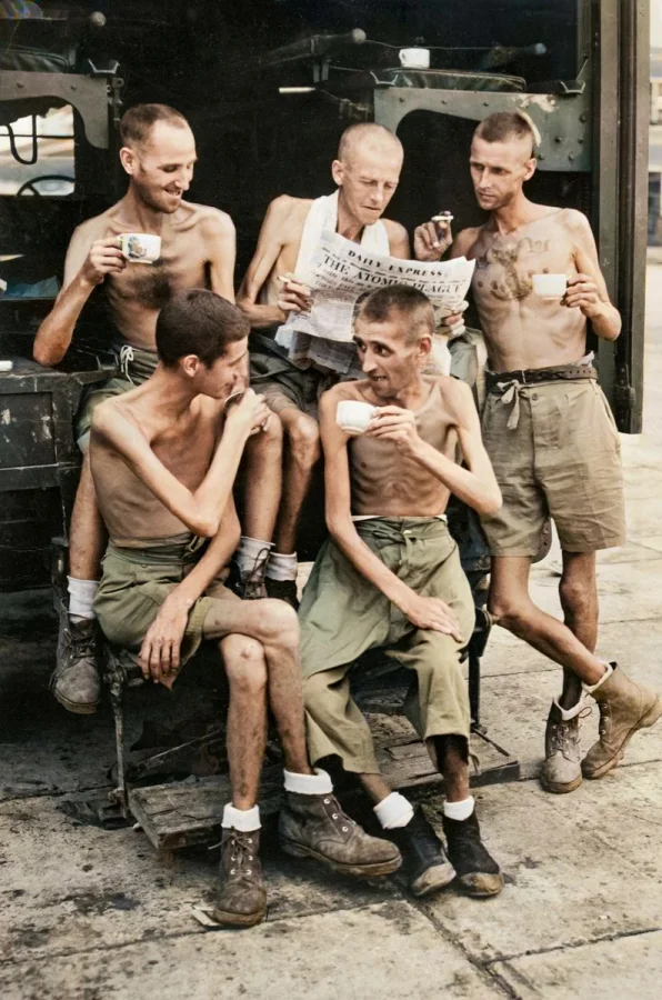 Британские солдаты после освобождения из японского плена в Сингапуре в 1945 году.