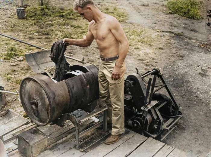 Американский танкист Уолли Раджиб стирает белье на самодельной стиральной машине в Новой Гвинее в 1942 году.