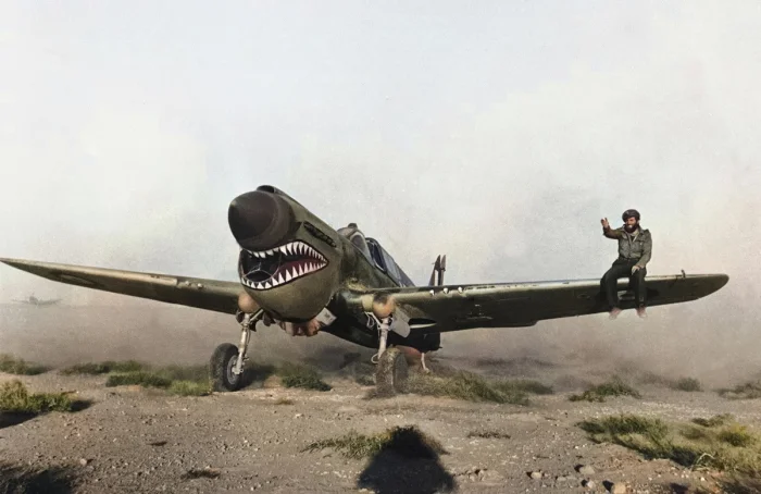 Авиамеханик указывает направление движения пилоту истребителя Кертисс Р-40 «Киттихок» 112-й эскадрильи Королевских ВВС Великобритании в Северной Африке в 1942 году.