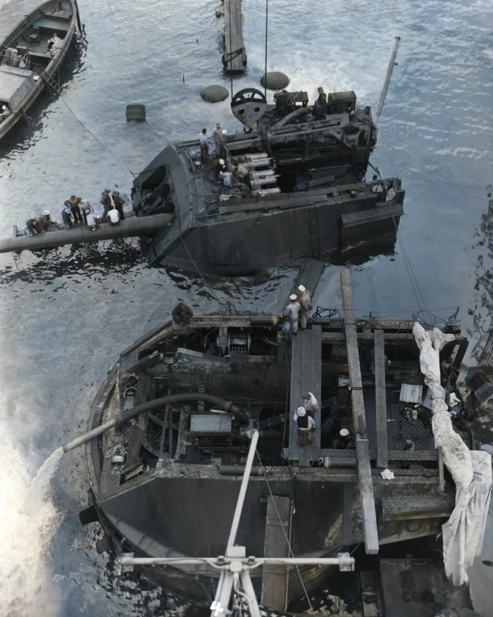 Демонтаж башен главного калибра с потопленного американского линкора «Аризона» после японской атаки на Пёрл-Харбор 7 декабря 1941 года.