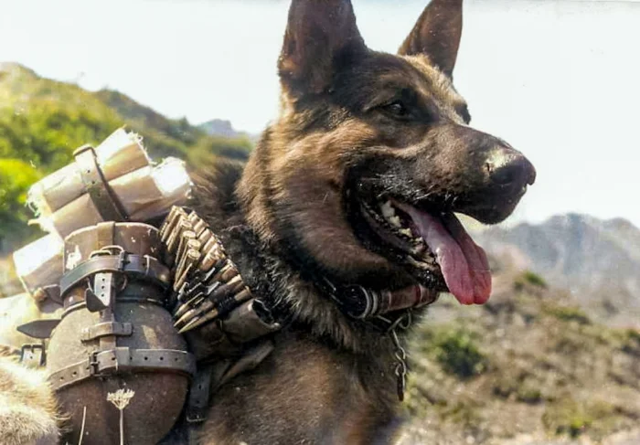 Немецкая служебная собака с флягой, бинтами и патронами в 1939-1945 годах.