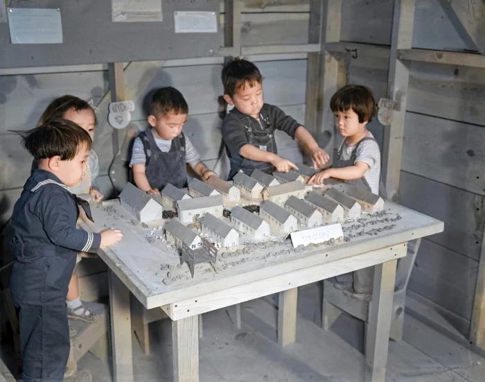 Дети интернированных японцев играют макетами своих бараков в центре перемещения «Tule Lake» в США, штат Калифорния, в 1942 году.