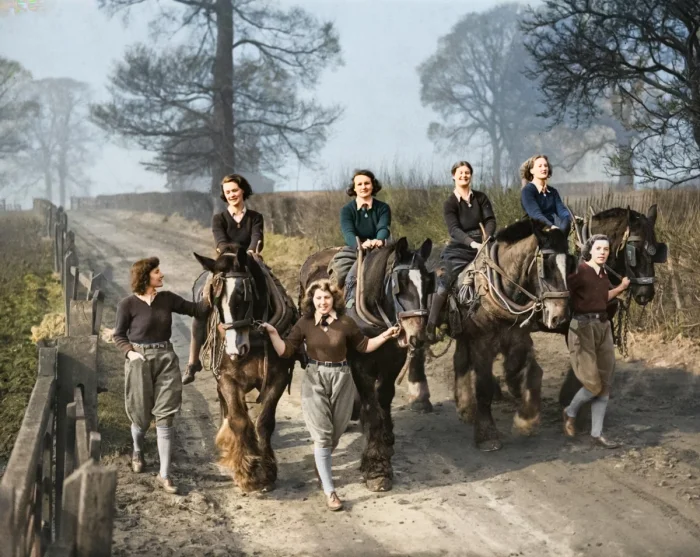 Женщины, медленно возвращаются с полей фермы под Эпсомом, что в графстве Суррей, как участницы Женской сухопутной армии, символизируя женский вклад в британское тыловое усилие во времена Второй мировой войны.