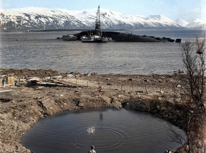 Норвежские дети играют у воронки от бомбы на фоне затонувшего линкора «Тирпиц» в 1949 году.