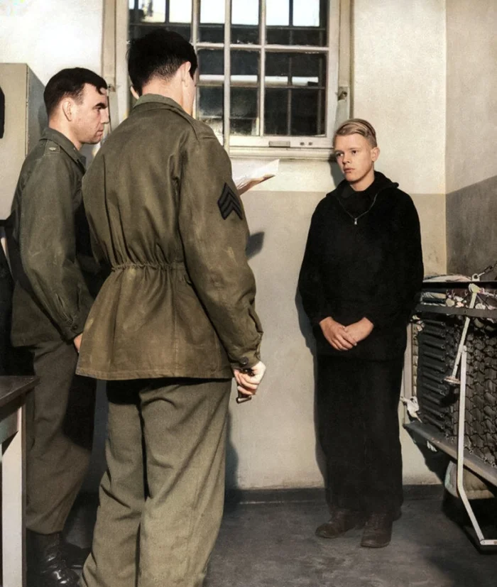 16-летний член Гитлерюгенда К. Пунцеллер слушает американского сержанта, зачитывающего приговор о пожизненном заключении за военные преступления в 1945 году.