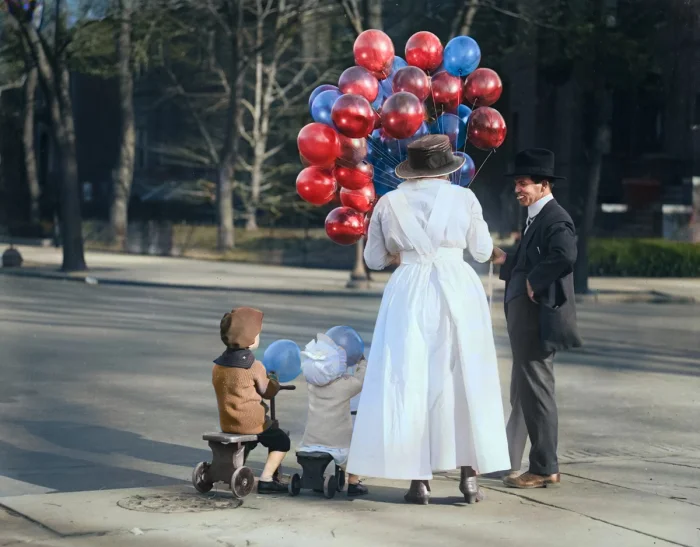 Женщина с двумя детьми покупает воздушные шары у продавца. США, 1919 год.