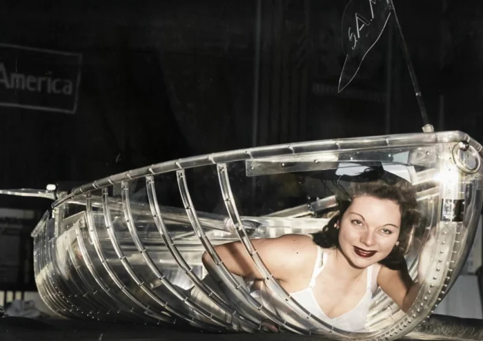 Селеста Радин в прозрачной гребной лодке «Люцит» на выставке изобретений в Нью-Йорке. Лодка выдерживает суровые условия эксплуатации и может перевозить 5 человек, 1941 год.