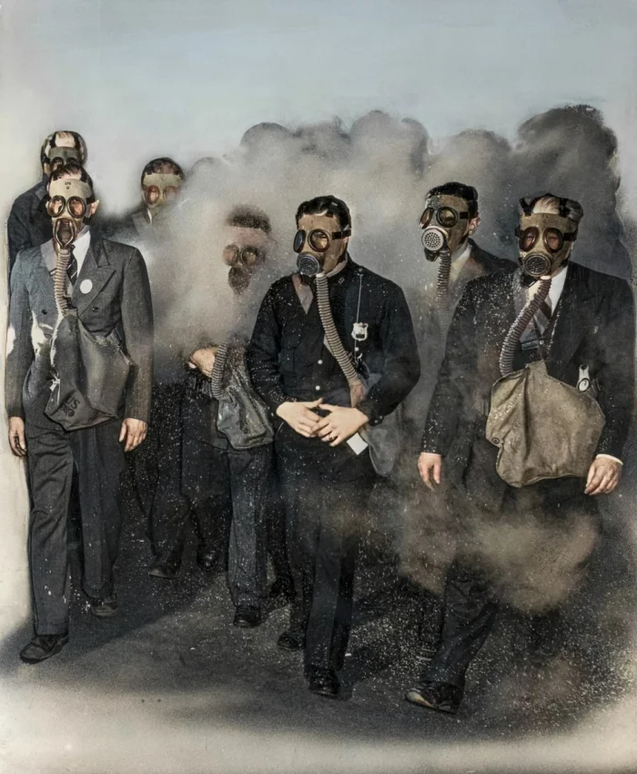 Полицейские и пожарные из Нью-Джерси тренируются пользоваться противогазами во время учебного пожара. Они тренируются тушить пожары, вызванные возможными авианалетами стран Оси.