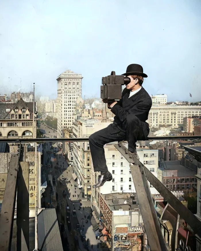 Фотограф снимает Нью-Йорк на 18 этаже над тротуаром Пятой авеню, 1906 год.