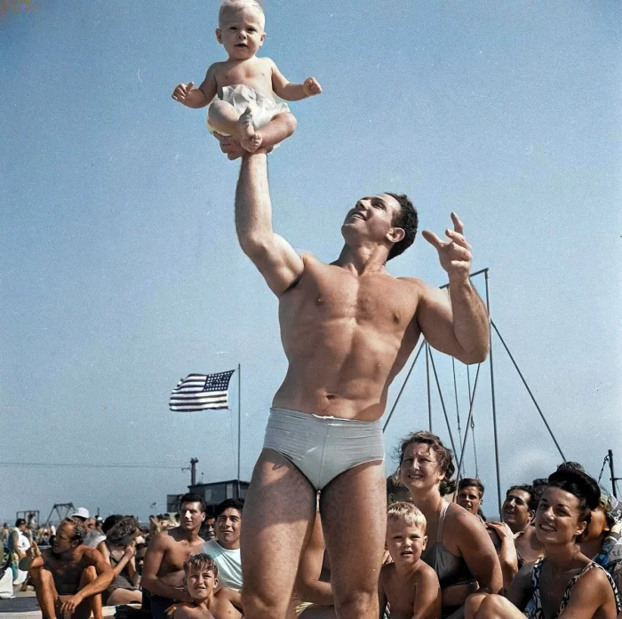 Бодибилдер с сыном в Маскл-Бич, Калифорния, 1949 год.