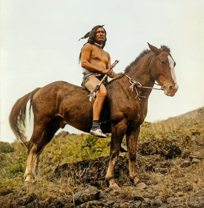 Воин из племени не-персе в набедренной повязке и мокасинах на коне. США, 1907 год.