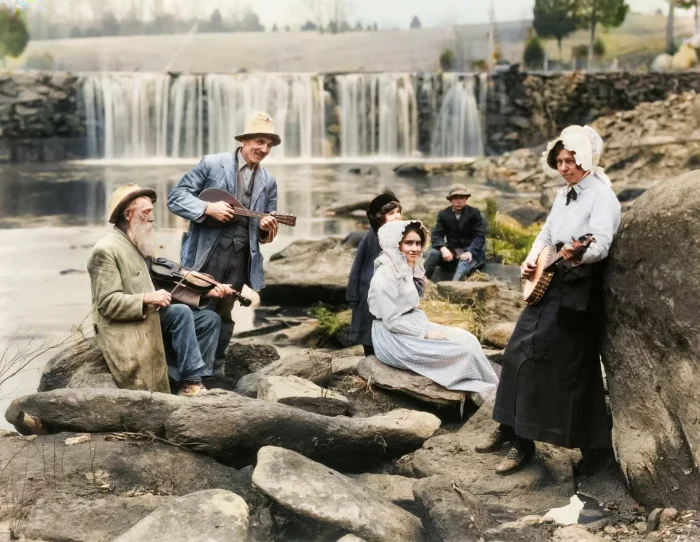 Группа музыкантов на скалистом берегу реки с водопадом на заднем плане на первом музыкальном фестивале в Вирджинии, 1931 год.