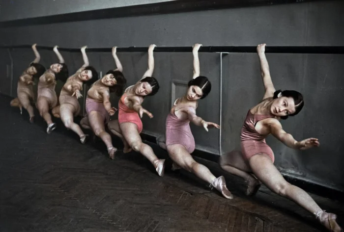 Девушки занимаются балетом в Доме физкультуры. СССР, 1930-е годы.
