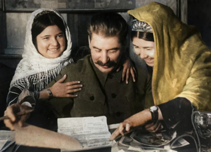 Иосиф Сталин с двумя молодыми колхозницами из Таджикской ССР на конференции рабочих хлопковых хозяйств, январь 1936 года.