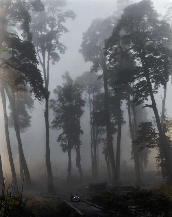 Насквозь атмосферный, тихий и немного загадочный кадр. Сквозь лёгкую дымку виднеются силуэты деревьев, и одинокий автомобиль.