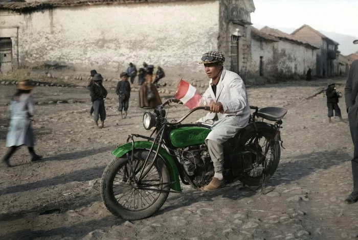 Перуанец передвигается на культовом мотоцикле фирмы «Индиан». Основанная в 1901 году, компания Indian Motocycle Manufacturing Company из Массачусетса стала пионером в мире двухколёсной техники.