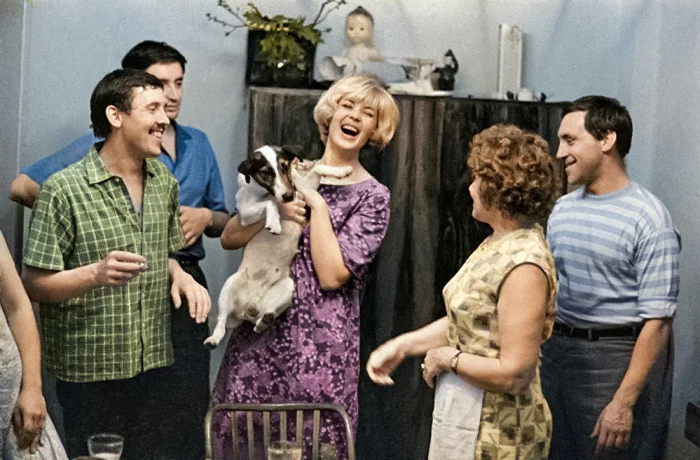 Артисты Театра на Таганке: Валерий Золотухин, Вениамин Смехов, Нина Шацкая (в центре) и Владимир Высоцкий в домашней обстановке. Москва, 1965 год.