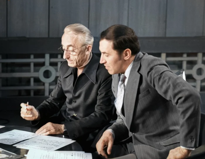 Французский исследователь Жак Ив Кусто и телеведущий Николай Дроздов на съемках передачи "В мире животных",1977 год.