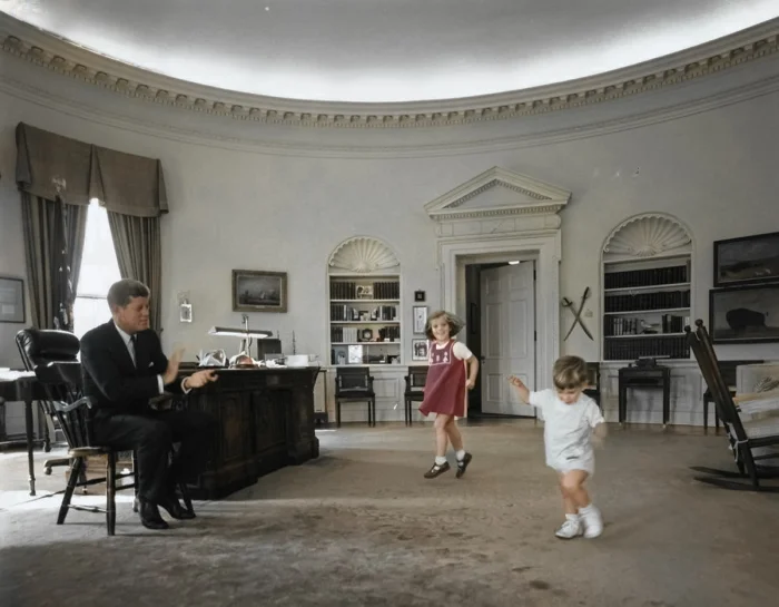 35-й президент США в Овальном кабинете наблюдает за танцами своих детей — сына Джона и дочери Кэролайн, 1962 год.