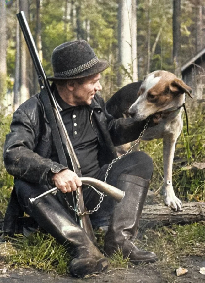 Лауреат Ленинской и Государственной премий, дважды Герой Социалистического Труда, конструктор стрелкового оружия Михаил Калашников на охоте в лесу, 1965 год.