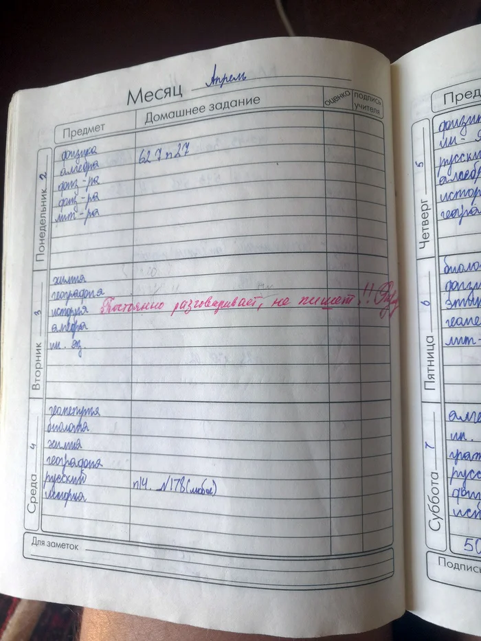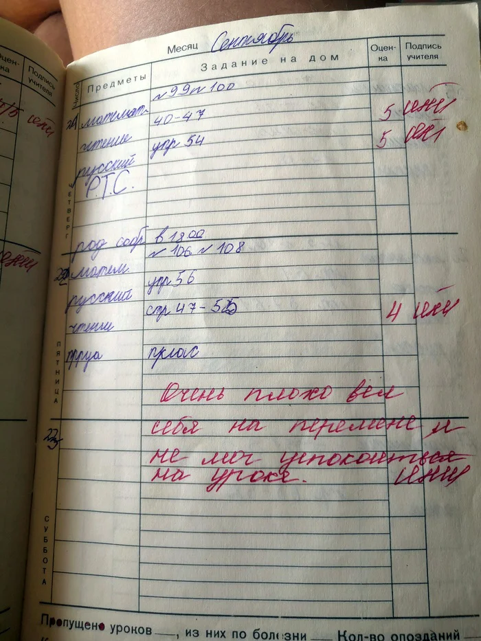 Второй класс запомнился без особых скандалов — хотя замечания за поведение, конечно, были. Это ведь 90-е, а в то время «школьная дисциплина» была понятием гибким: кто-то спорил с учителем, кто-то сбегал с уроков, а кто-то — писал в дневнике ответы, чтобы не забыть.