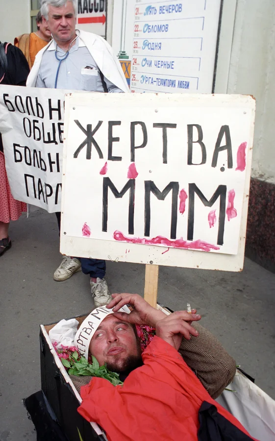 Члены общества "Возрождение" на акции в поддержку обманутых вкладчиков АО "МММ" на Арбатской площади, 1995 год.
