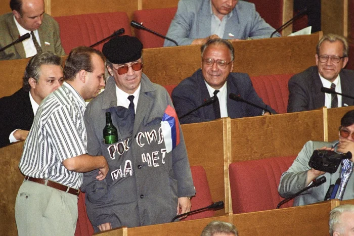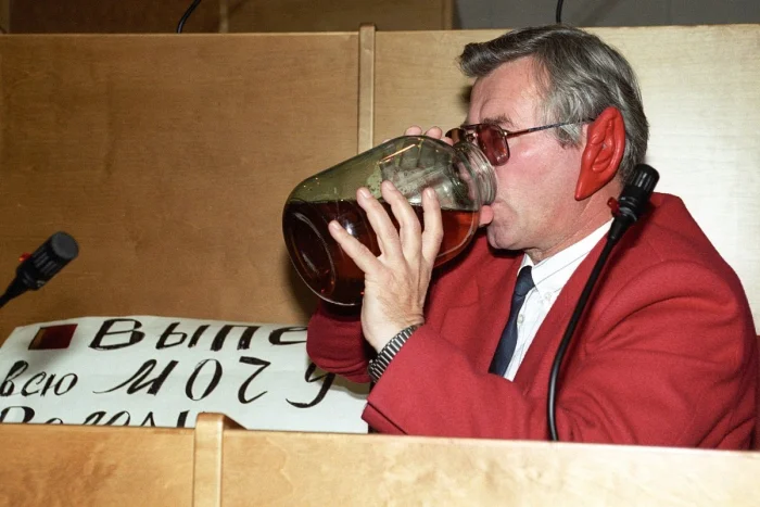 Депутат Вячеслав Марычев в образе спивающегося россиянина, 1990-е годы.