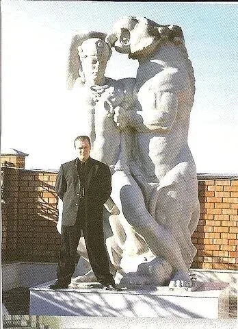 Продюсер «Ласкового мая» Андрей Разин позирует у статуи во дворе своего замка. Ставрополь, 1990-е годы.