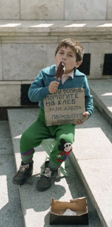 Ребёнок просит денег на хлеб, ест эскимо. Москва, 1998 год.