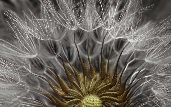 Изящная структура соцветия крестовника, заполненная крошечными семенами, каждый из которых оснащен пушистым хохолком, облегчающим его распространение и будущее прорастание в благоприятных условиях. Это яркий пример эффективных механизмов размножения в природе.