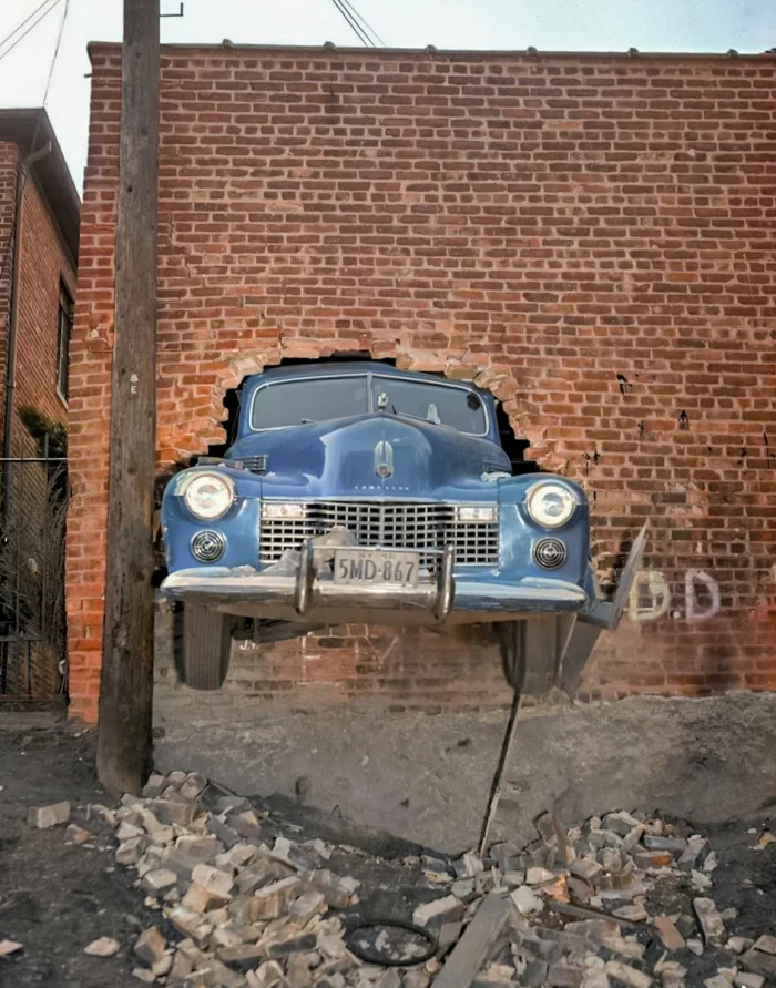«Нос» нового Кадиллака торчит сквозь кирпичную стену. США, 1948 год.