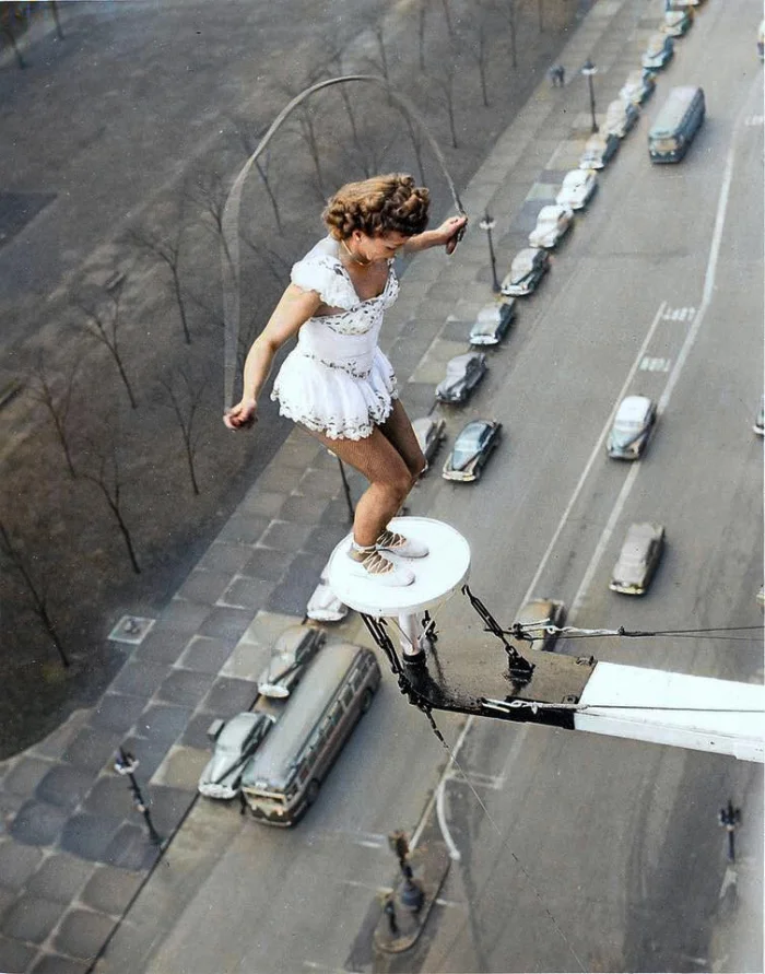 На этой фотографии, сделанной в 1955 году, запечатлена Бетти Фокс, выполняющая акробатический номер — она прыгает на скакалке. Особенность выступления заключается в том, что площадка для трюка была сооружена прямо из окна небоскрёба.