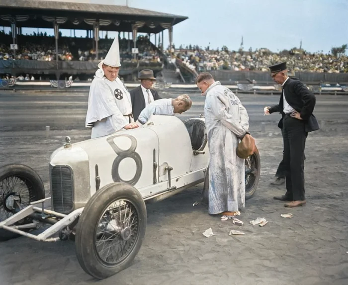 Члены Ку-клукс-клана осматривают гоночный автомобиль Miller Special, принадлежащий Ральфу де Пальме, на гоночной трассе Оверленд-парка в Денвере, штат Колорадо, 1925 год.