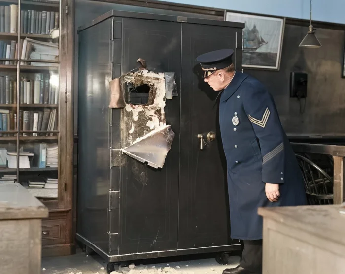 Сержант Салливан исследует сейф, который попытались взломать трое молодых преступников. США, 1930-е.