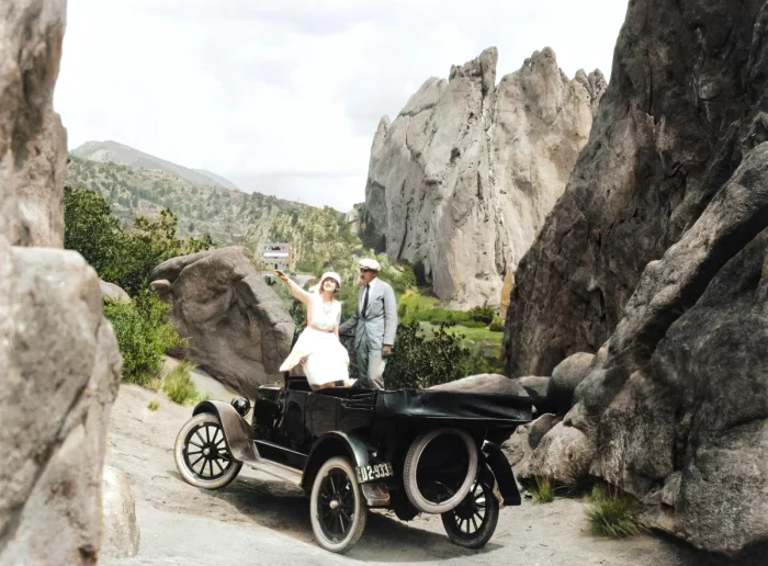 Пара в короткометражном немом фильме из серии Paramount Comedy Travels. Голливуд, Калифорния, конец 1910-х годов.
