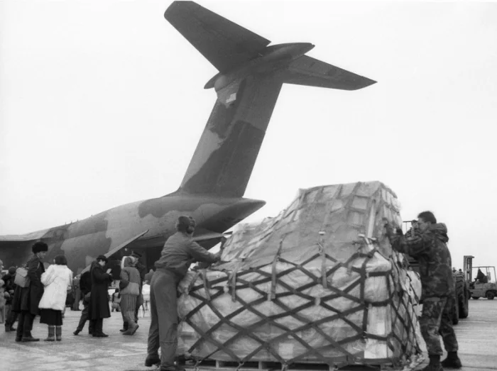 8. Работники аэропорта разгружают самолет ВВС США, Lockheed C-5 Galaxy, прибывший в Москву с грузом гуманитарной помощи, 10 февраля 1992 г.