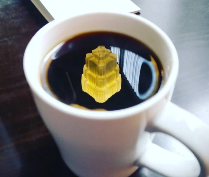 В этой фотографии светильник пирамидальной формы отражается в очень черном кофе, создавая геометрическую иллюзию.