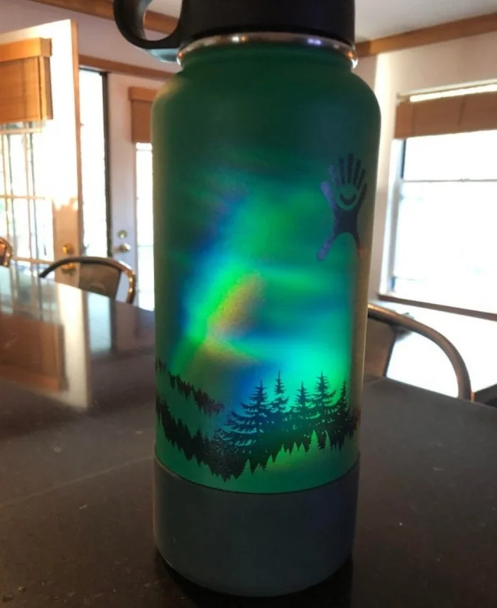 На этой фотографии отражение в бутылке с водой похоже на тайгу под северным сиянием, создавая эффект, который можно принять за фотошоп.
