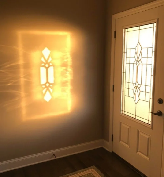 На этой фотографии яркие лучи утреннего солнца усилены остеклением двери, создавая динамичную и светлую сцену.